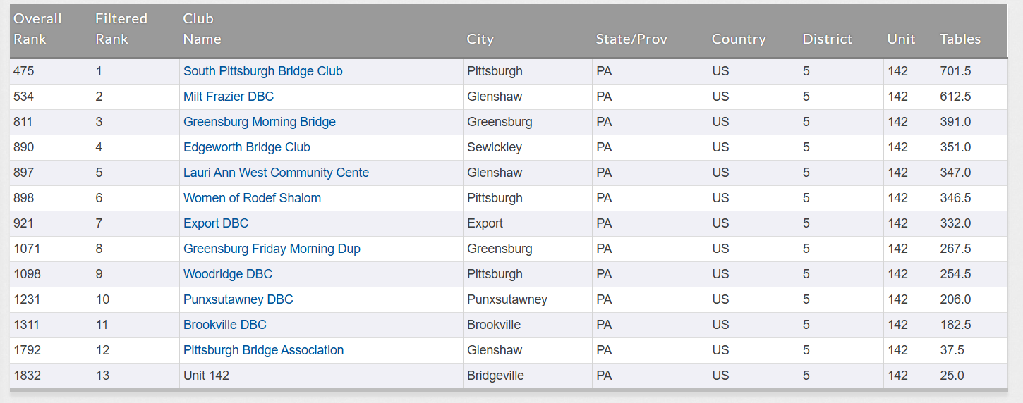 Unit 142 clubs hosted 4,054 tables in 2025, down 2% from last year. Congratulations to the South Pittsburgh Bridge Club for finishing the year in the ACBL's top 500.