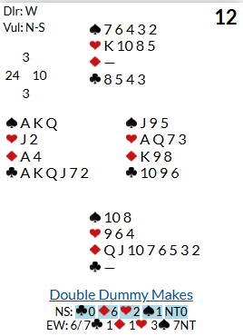 One of the joys of bridge is seeing your partnership agreements produce great results at the bridge table. Karl and Dustin have crafted their own version of Precision. They are often asked who to defend against a strong club opening. They advise using the Truscott Defense. On Board 12 of Thursday's 2nd session, they used the Truscott Defense over a strong 2♣ opening. After West opened 2♣, Dustin, sitting North, overcalled 2♥ showing the majors. East bid 2NT' and Karl risked advancing the inference to 3♥ at unfavorable vulnerability. When East-West stopped in 3NT, Karl and Dustin won 88% of the matchpoints.