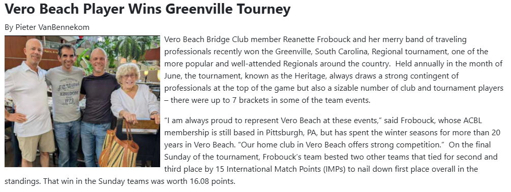 Pittsburgh is fortunate to have Grand Life Master Reanette Frobouck support our clubs during the Spring, Summer, and Fall. Reanette's teams make Regionals more compelling by giving local players the opportunity to meet and play against some of the best players in the world.